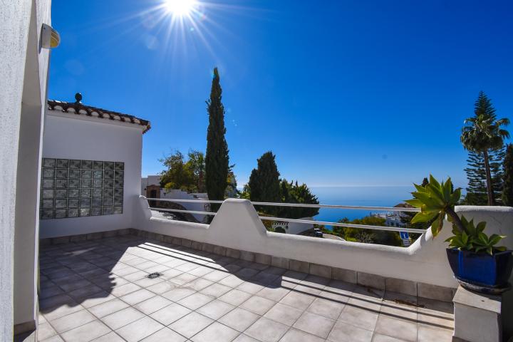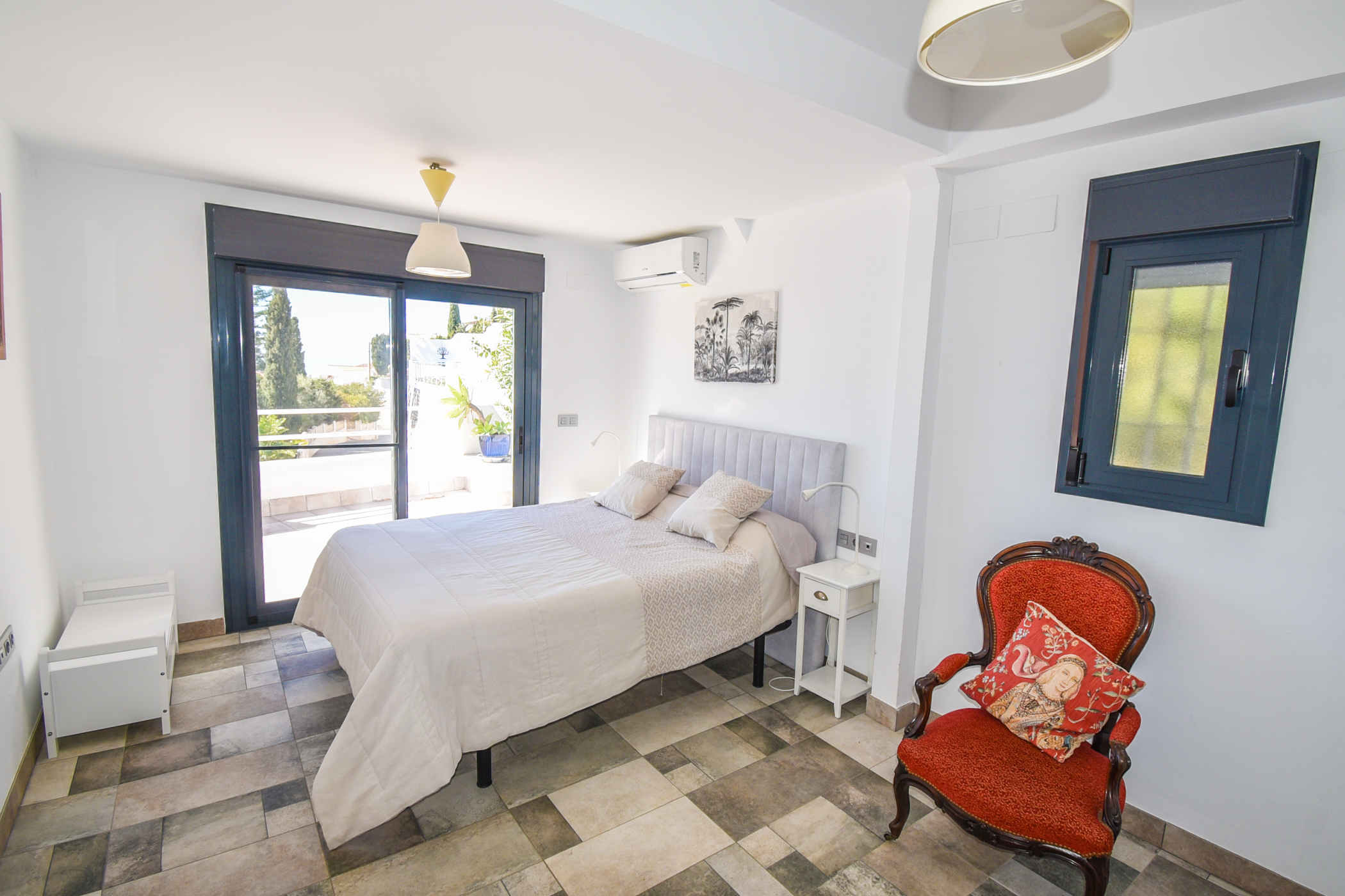 Master bedroom with king-size bed, privileged sea views, and direct access to the terrace. - Two additional bedrooms with twin beds, all with ample built-in wardrobes.