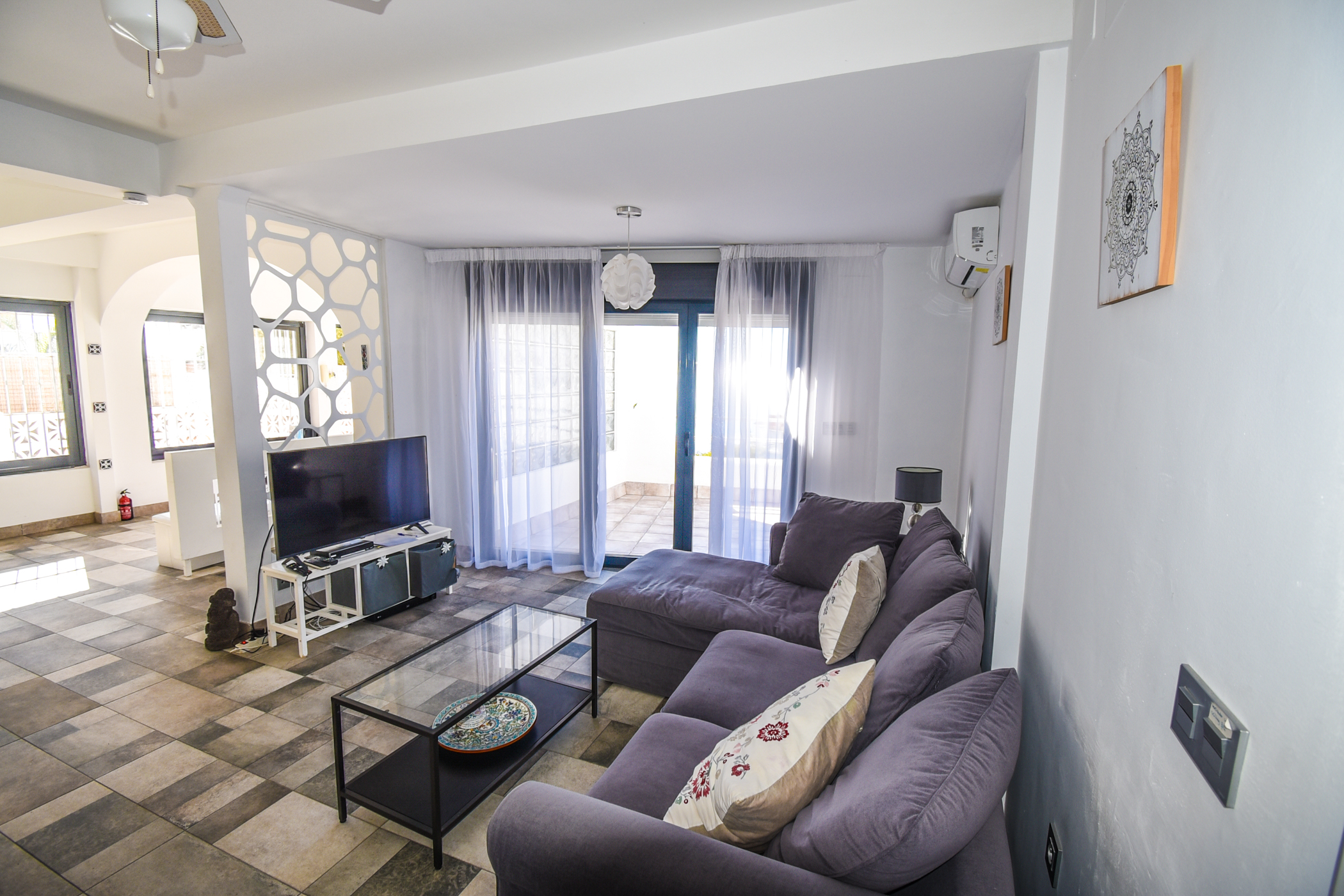 - Bright and welcoming living room with large floor-to-ceiling windows that flood the space with natural light and direct access to the main terrace.