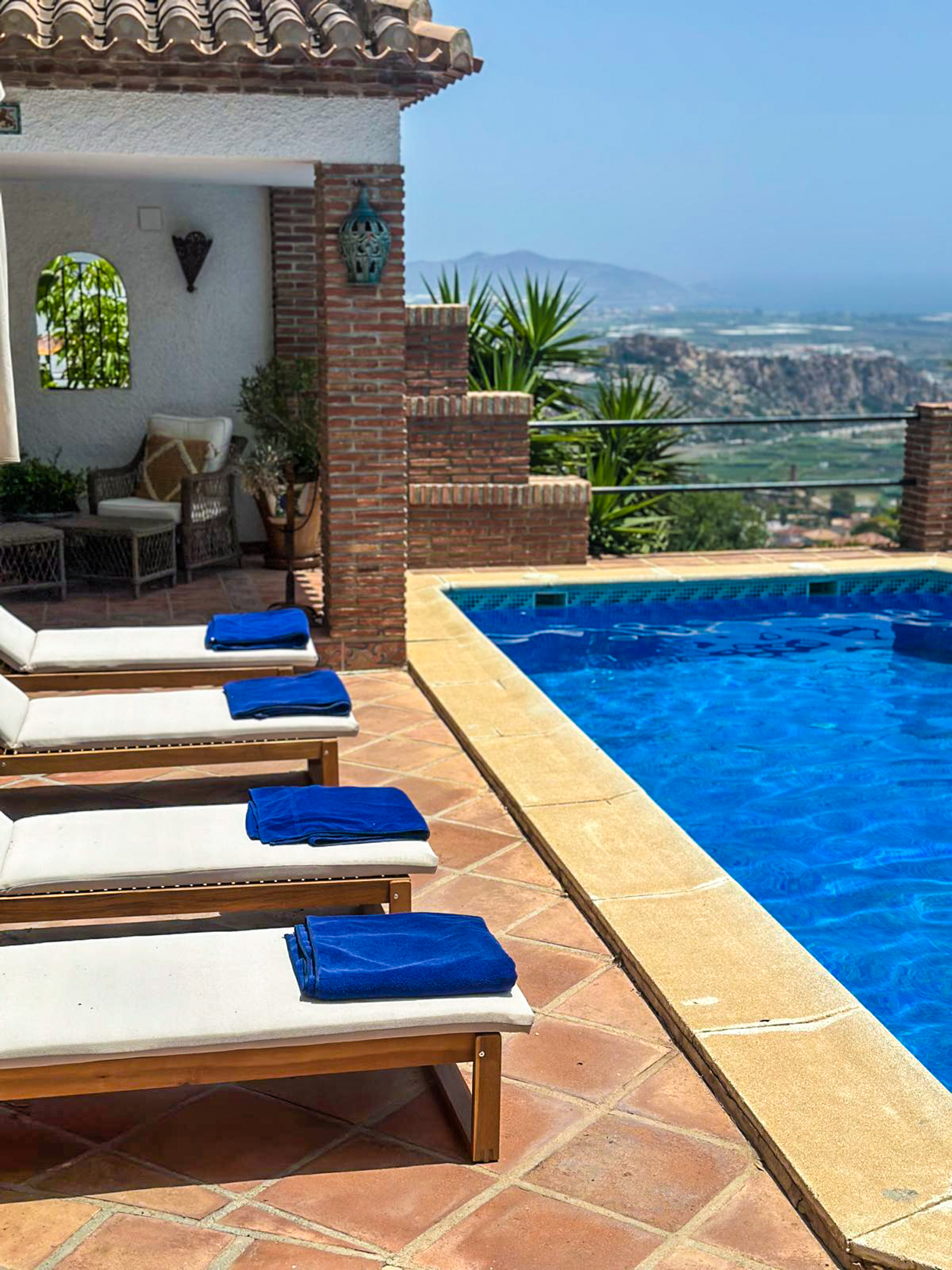 Diese luxuriöse und geräumige Villa mit 4 Schlafzimmern fügt sich perfekt in die hüglige Umgebung ein, in der sie liegt. Die Villa bietet einen Panoramablick auf das Mittelmeer, die Burg von Salobreña und die romantische Landschaft der Costa Tropical. Die Wohngegend “Monte Los Almendros” genießt einen guten Ruf und ist bei anspruchsvollen Gästen aus Skandinavien und Deutschland besonders beliebt. Genießen Sie die Aussicht auch vom Pool.